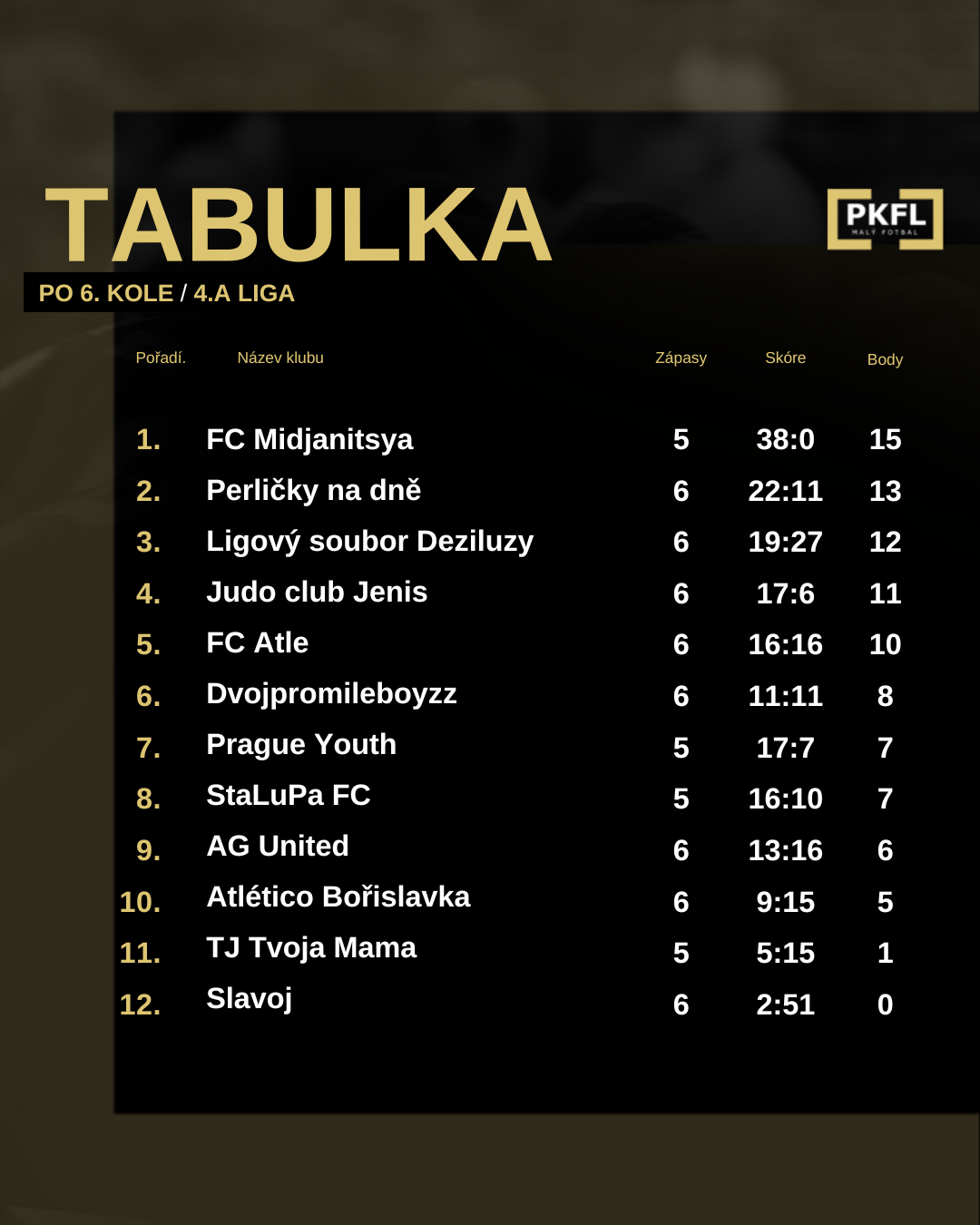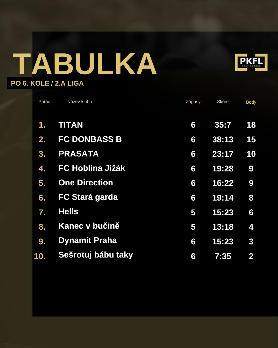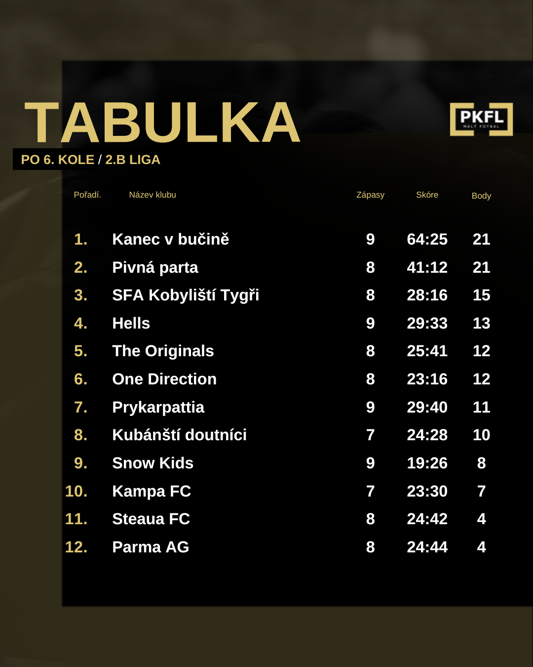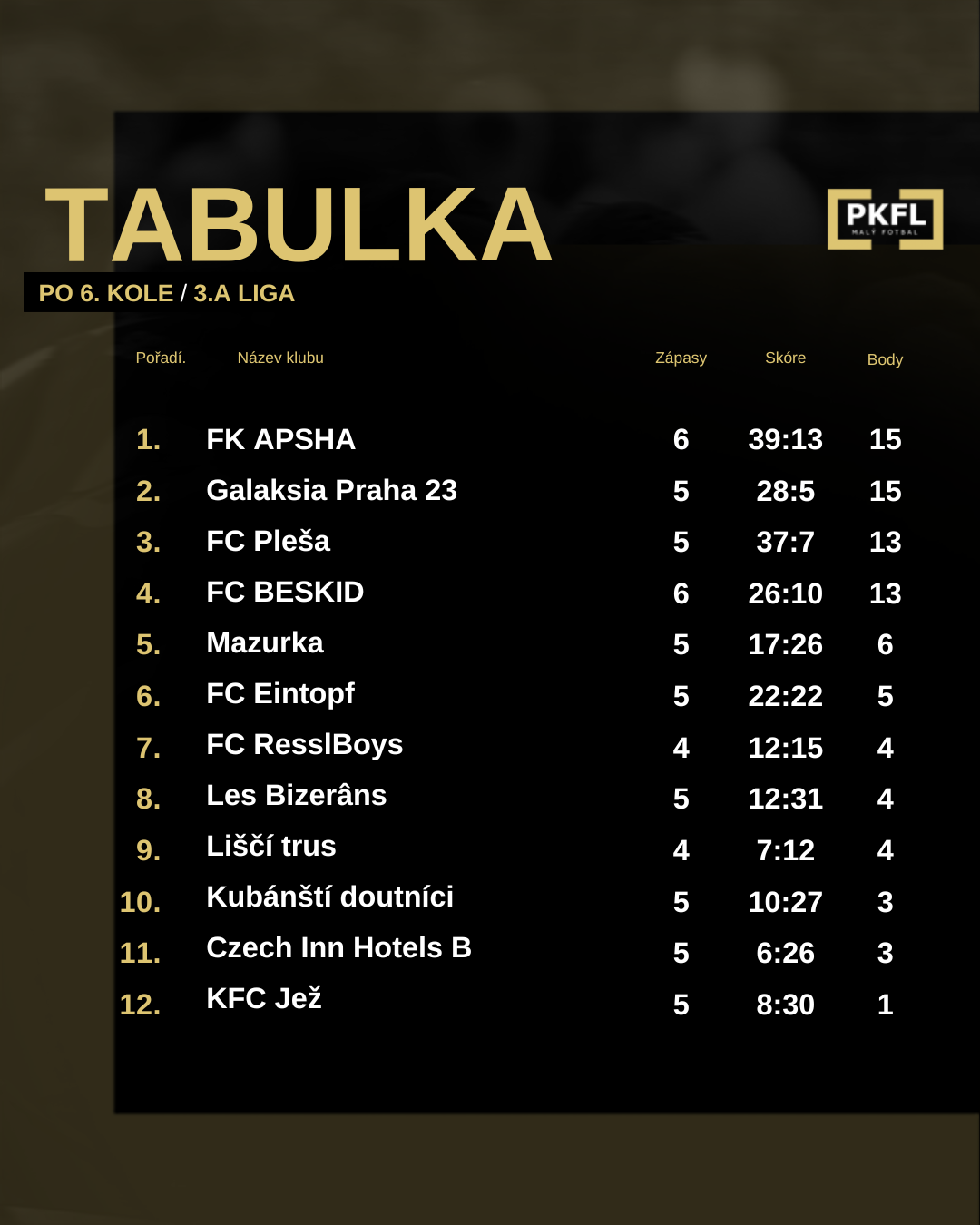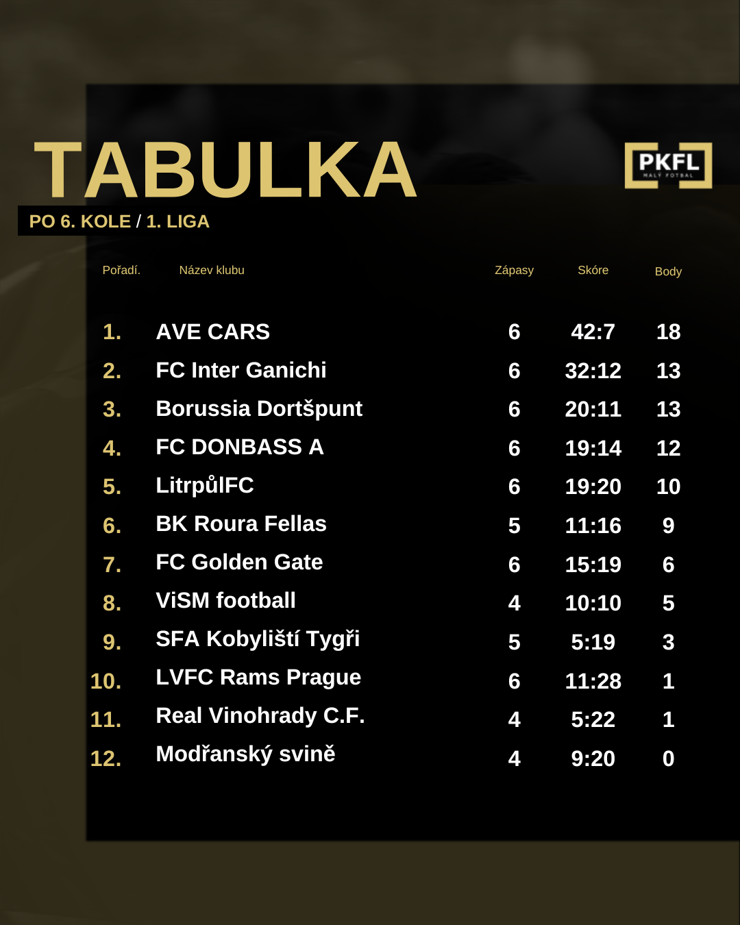 Na čele tabulky se drží muži z AVE CARS, kteří zatím nenašli přemožitele a i po šesti kolech zůstávají stoprocentní. Hned za nimi se drží hráči FC Inter Ganichi, kteří mají na kontě 13 bodů a o druhé místo se dělí díky lepšímu skóre.