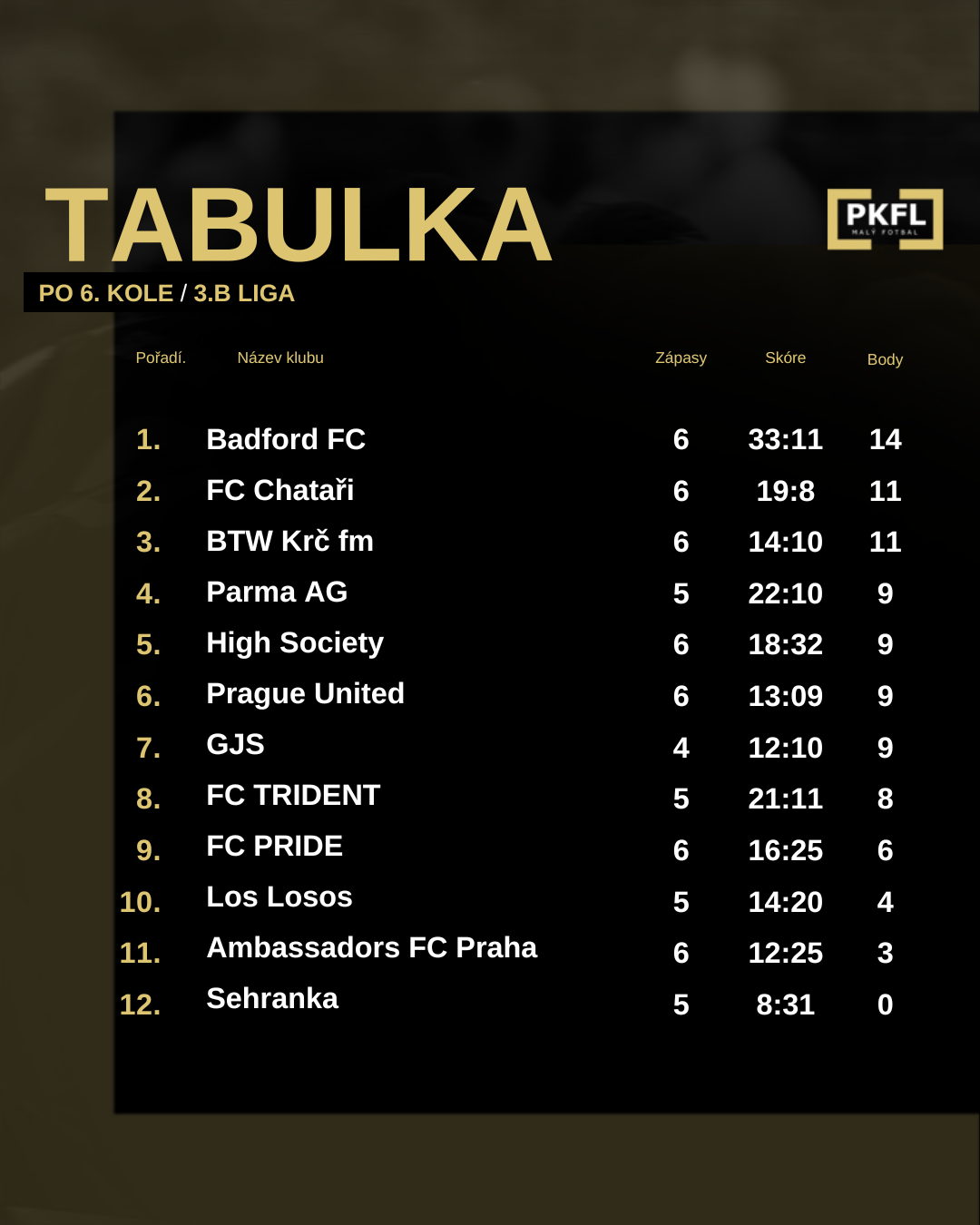 Ve středu tabulky je situace mimořádně napjatá – čtyři týmy mají po devíti bodech: Parma AG, High Society, Prague United a GJS. Parma má zápas k dobru a výborné skóre 22:10, High Society sází na útočnou hru, ale trpí v obraně, Prague United spoléhá na pevnou defenzivu a GJS má při menším počtu zápasů stále velký prostor pro posun.