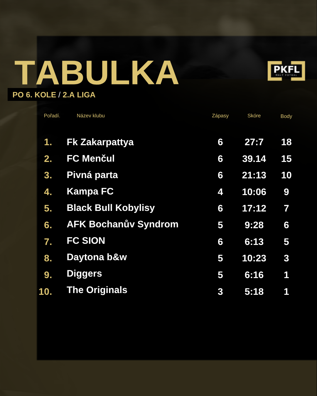 Na čele tabulky se drží tým AVE CARS, který zatím nenašel přemožitele a i po šesti kolech zůstává stoprocentní. Hned za nimi se drží FC Inter Ganichi, jenž má na kontě 13 bodů a díky lepšímu skóre okupuje druhou příčku.