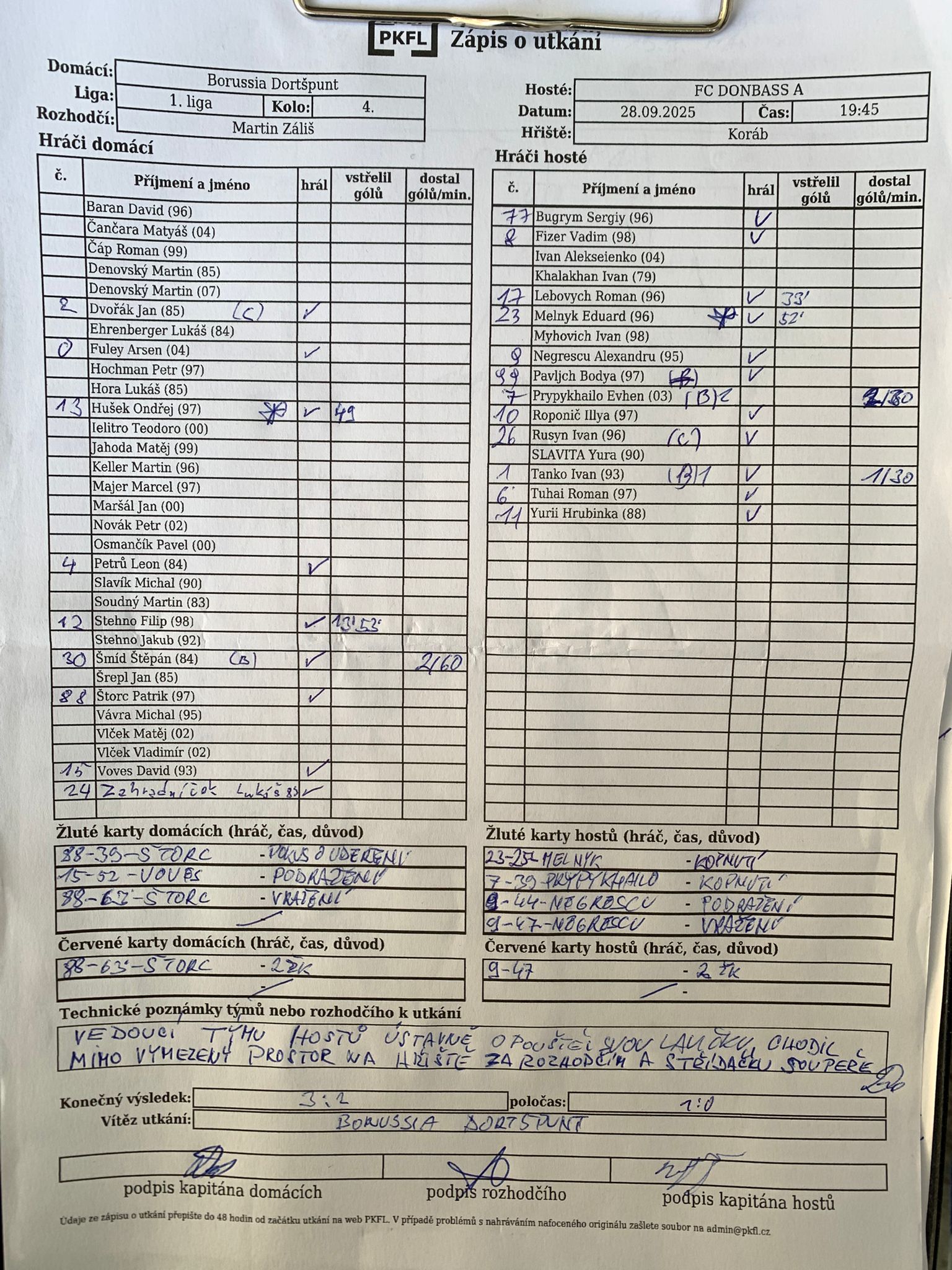 Komentář: Utkání bylo velmi emotivní, doprovázené komentářemi, spoustou soubojů na hranici pravidel a došlo i na urážky od obou týmů v prostoru laviček. Často docházelo k nevhodnému komentování a dotazování místo samotného soustředění se na vlastní výkon. Hosté byli favoritem utkání a i přes oslabení od 47’ si vytvořili spoustu slibných příležitostí, ale ani několik sólových protiútoků ke vstřelení gólu nevedlo. TP: Vedoucí domácích: vedoucí týmu hostů ústavně opouštěl svou lavičku, chodil mimo vymezený prostor na hřiště za rozhodčím a střídačku soupeře Vyjádření R: Vedoucí šel do prostoru hřiště, ale než ke mně přišel tak se otočil a šel zpět. K opuštění prostoru lavičky došlo na obou stranách, které bylo následkem oboustranné slovní přestřelky. Nevhodné chování realizačních týmů a hráčů na lavičkách podpořilo emoce na hrací ploše.