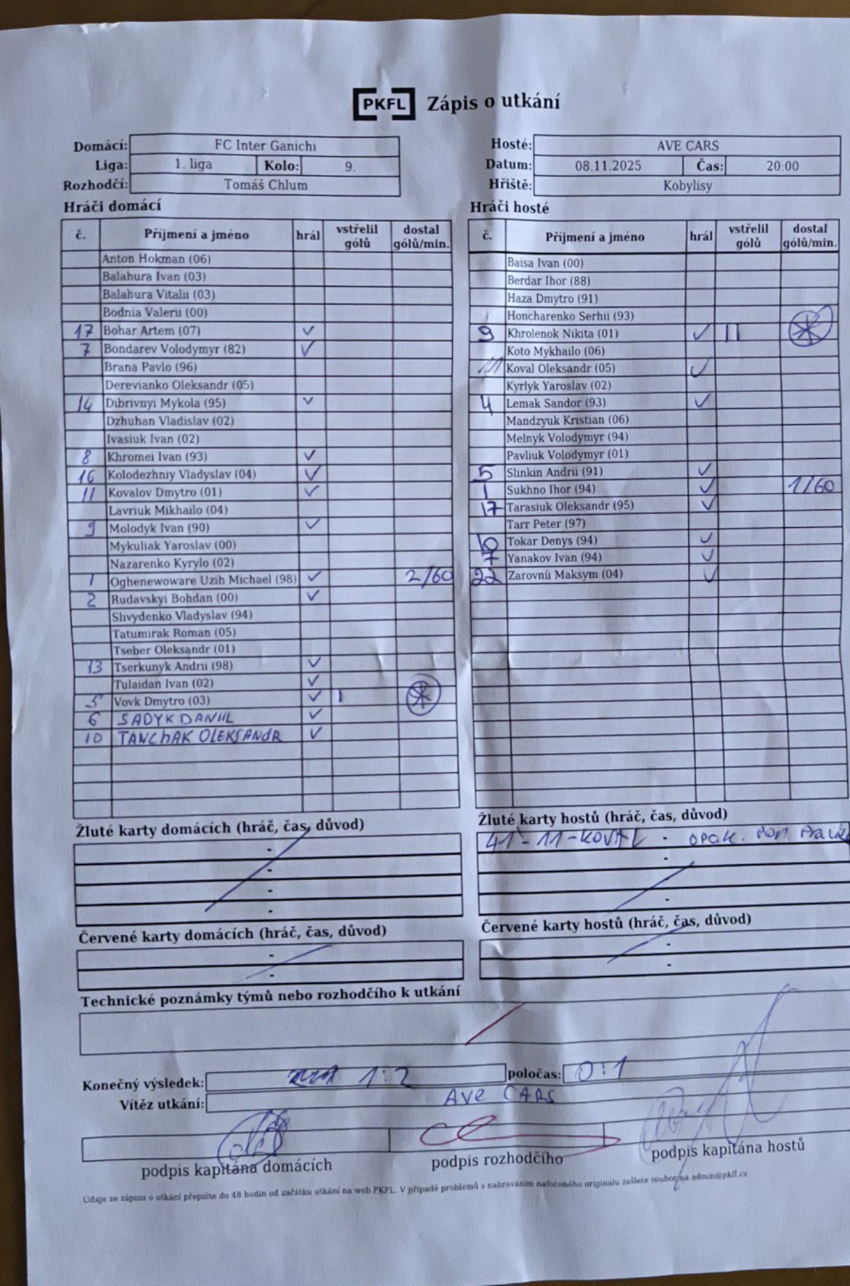 Komentář: Vyrovnaný zápas se odehrál v sobotním večeru na hřišti v Kobylisích. Střetly se dva týmy, které působí v 1. lize PKFL. Úvod utkání byl z obou stran opatrný, ale domácí chtěli využít výhody domácího prostředí a snažili se diktovat tempo hry. Naráželi však na pozornou obranu hostů a skvěle chytajícího brankáře. Hostující tým měl výborné držení míče a nebezpečné protiútoky, ale nedokázal je proměnit v gól. Zaváhání domácího brankáře při rozehrávce však znamenalo vedení hostů – přesnou střelou z poloviny hřiště se prosadil Khrolenok. Do šaten se tak šlo za stavu 0:1 pro AVE CARS. Do druhého poločasu vstoupily oba týmy s jasnou snahou změnit skóre, což přineslo rychlejší tempo a šance na obou stranách. Ujala se však až další střela Khrolenoka, a hosté tak zvýšili na 0:2. Domácí tým dokázal o několik minut později snížit zásluhou pohotového zakončení Vovka, což připravilo půdu pro dramatický závěr utkání v posledních pěti minutách. Hosté ale tlak soupeře ustáli a odvážejí si z Kobylis těžce vydřené tři body.