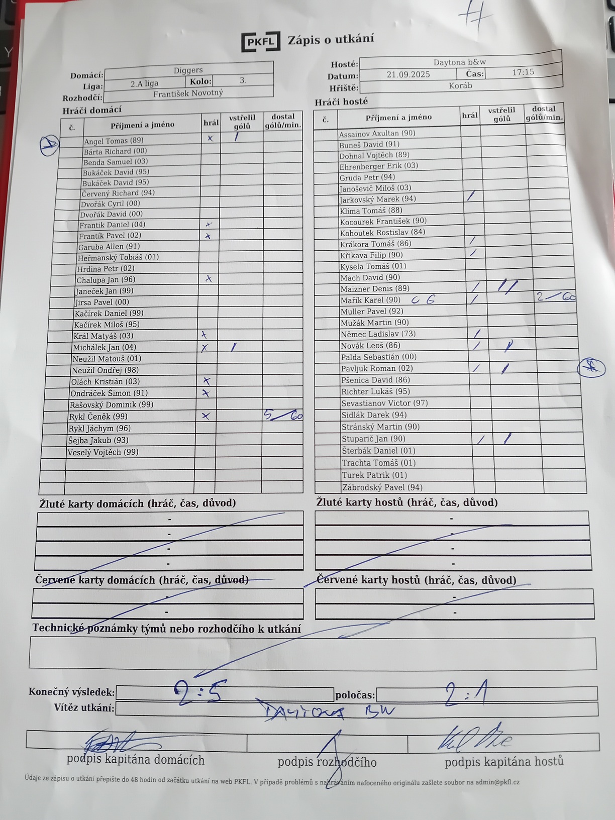 Komentář: Klání o dvou rozdílných poločasech, kdy první dějství ovládli po trefách Angela s Michálkem Diggers a druhou polovinu opanovala Daytona, která vměstnala hned 3 trefy do rozmezí 42. a 46. minuty, což bylo pro další vývoj utkání rozhodující a hosté už si 3 body vzít nenechali.