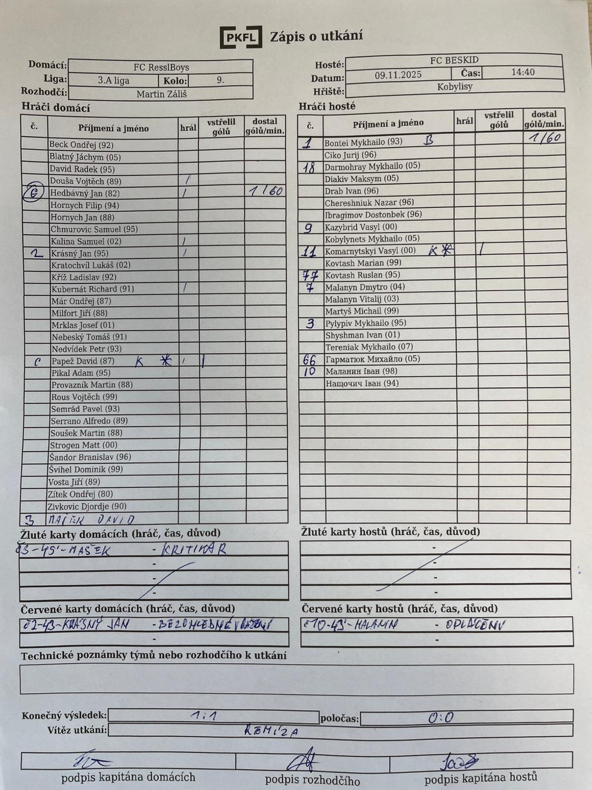 Komentář: Zápas plný vypjatých emocí z neproměněných šancí. Domácí ve 32’ vstřelili první branku zápasu a ujali se vedení. Snažili se kontrolovat držení míče a celkem se jim to dařilo. Průběžně docházelo k menším faulům a ve 43’ po prohraném souboji se domácí Krásný rozhodl poslat k zemi hned prvního soupeře v jeho blízkosti. To se nelíbilo hostujícímu Malanynovi a ten mu jeho bezohlednost hned šel oplatit. Hosté si v závěru vytvořili tlak a v 57’ se jim podařilo vyrovnat. Domácí sice měli možnost skórovat do nekryté branky, ale spíše se zaměřovali na jen na bránění. Věřím, že odveta na jaře bude v duchu Fair play.