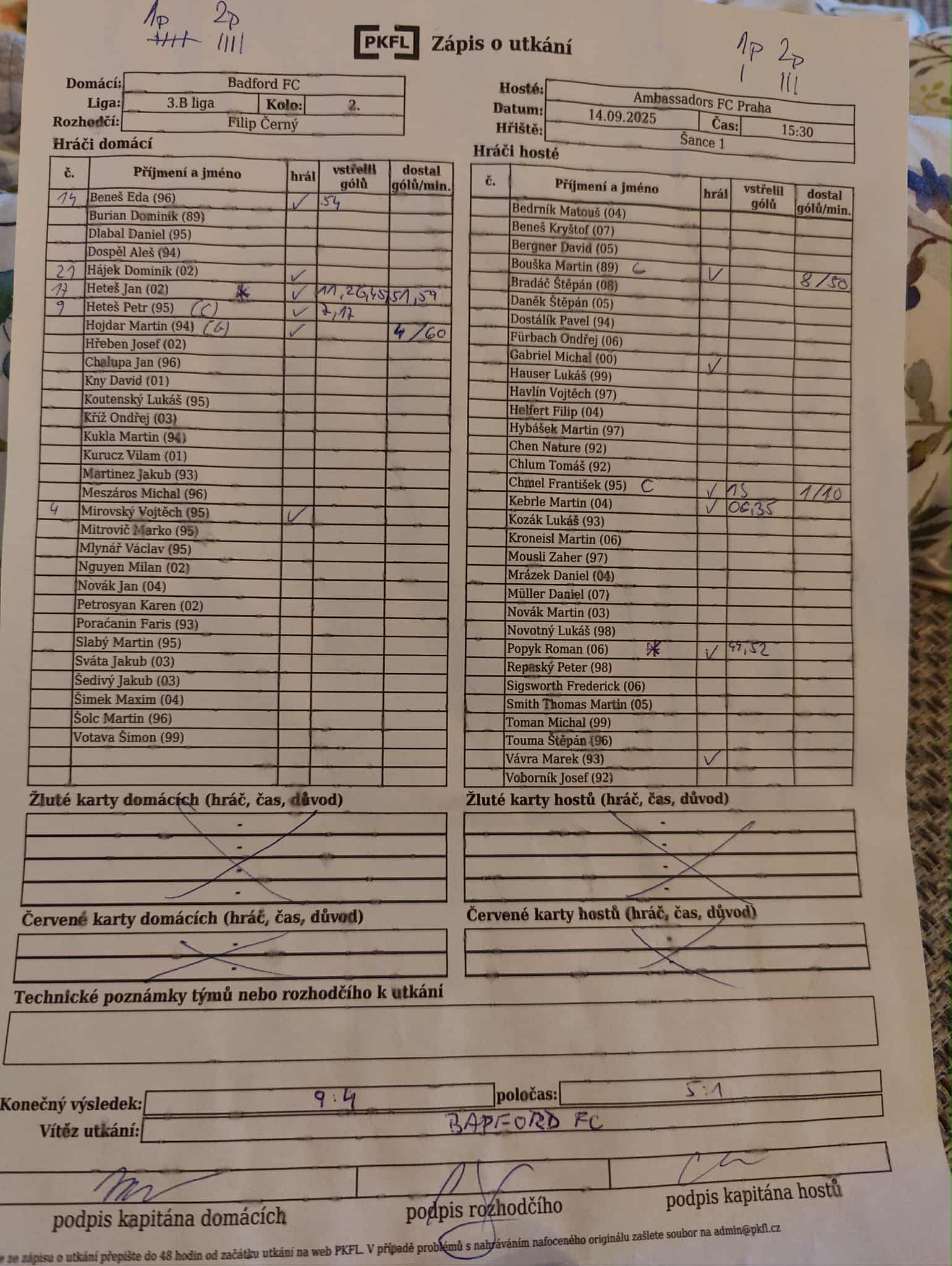Komentář: Domácí bez střídání, jak je jejich dobrým zvykem přivítali Ambasadors, kteří v docházce nebyli o nic lepší. Domácí sice náhradnímu brankáři za 10 minut dali jen jeden gól, ale poté se jim dařilo i proti M. Bouskovi, který zachraňoval svůj tým od postupně 10. Hosté v druhé půli přeci jen zkvalitnili hru a tak konečné skóre dopadlo 9:4