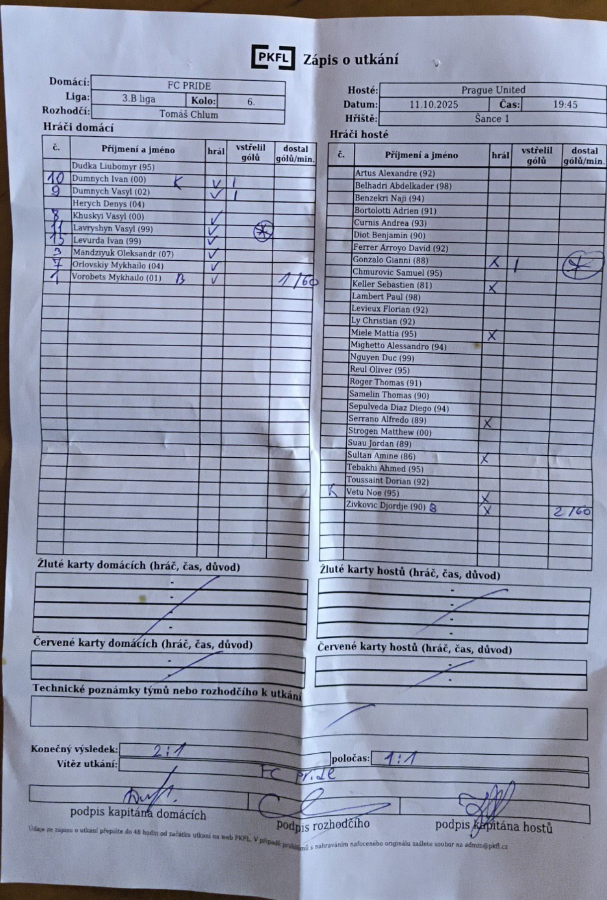 Komentář: Vyrovnané utkání nám rozhodli ve prospěch domácích bratrské duo Dumnychovi kteří svými brankami zařídili 3 body pro FC Pride . Oba týmy se snažili hrát fotbal a bylo minimum faulu fair play zápas z obou stran .