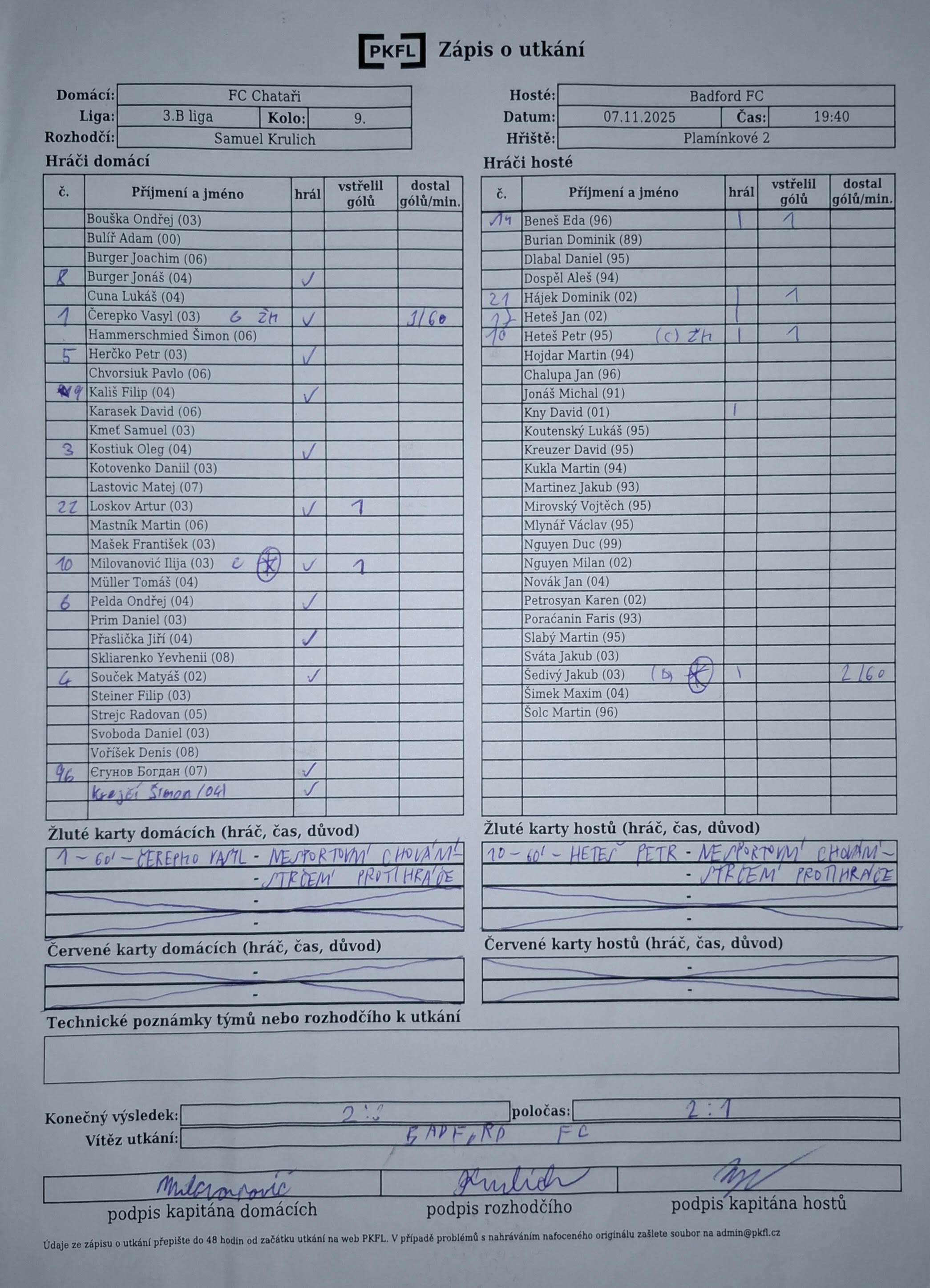 Komentář: Do zápasu o průběžné první místo tabulky 3.B ligy nastoupili domácí Chataři v hojném počtu, kdežto hostující Badford byl bez střídání. V prvním poločase byli lepší domácí, z velkého množství šancí se dokázali dvakrát prosadit. Ve druhém poločase se však poměry vyrovnaly a hostům se v rozmezí 43. a 49. minuty podařilo nejprve vyrovnat a poté otočit skóre ve svůj prospěch. Sporný moment nastal okolo 50. minuty, kdy brankář domácího týmu vyrážel míč těsně okolo brankové čáry. Rozhodčí míč celým objemem za brankovou čárou neviděl a hra tak pokračovala. Nic to však nemění na faktu, že hosté získávají 3 body a zůstávají tak samotní v čele tabulky 3.B ligy.