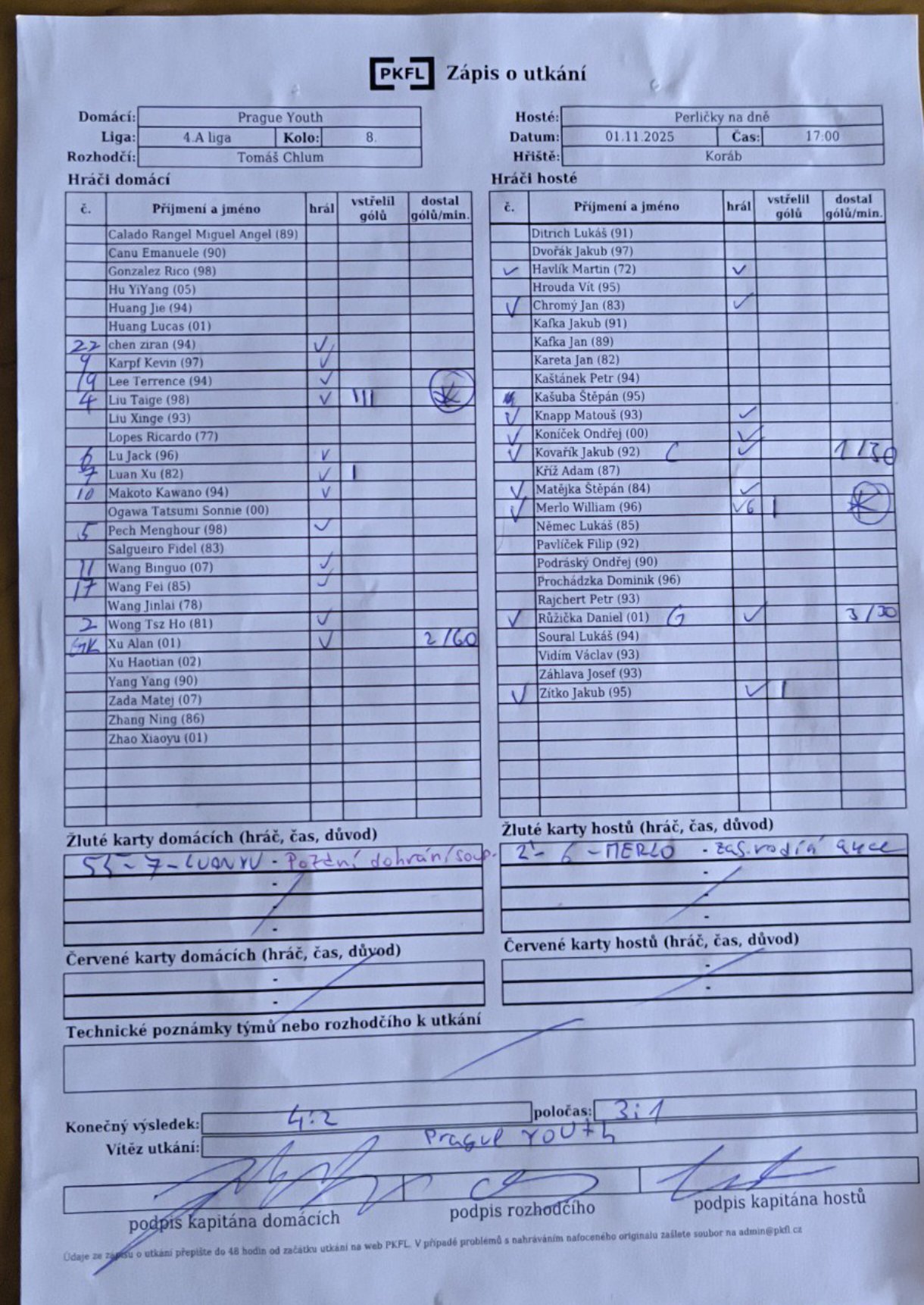 Komentář: Vyrovnaný zápas a hosté se dokázali ujmout vedení ,ale domácí dokázali otočit vývoj utkání a převzít otěže celého zápasu ve svůj prospěch . A kdyZ Liu Taige skompletpval hattrick tak to byl on který dovedl svůj tým ke 3 bodům