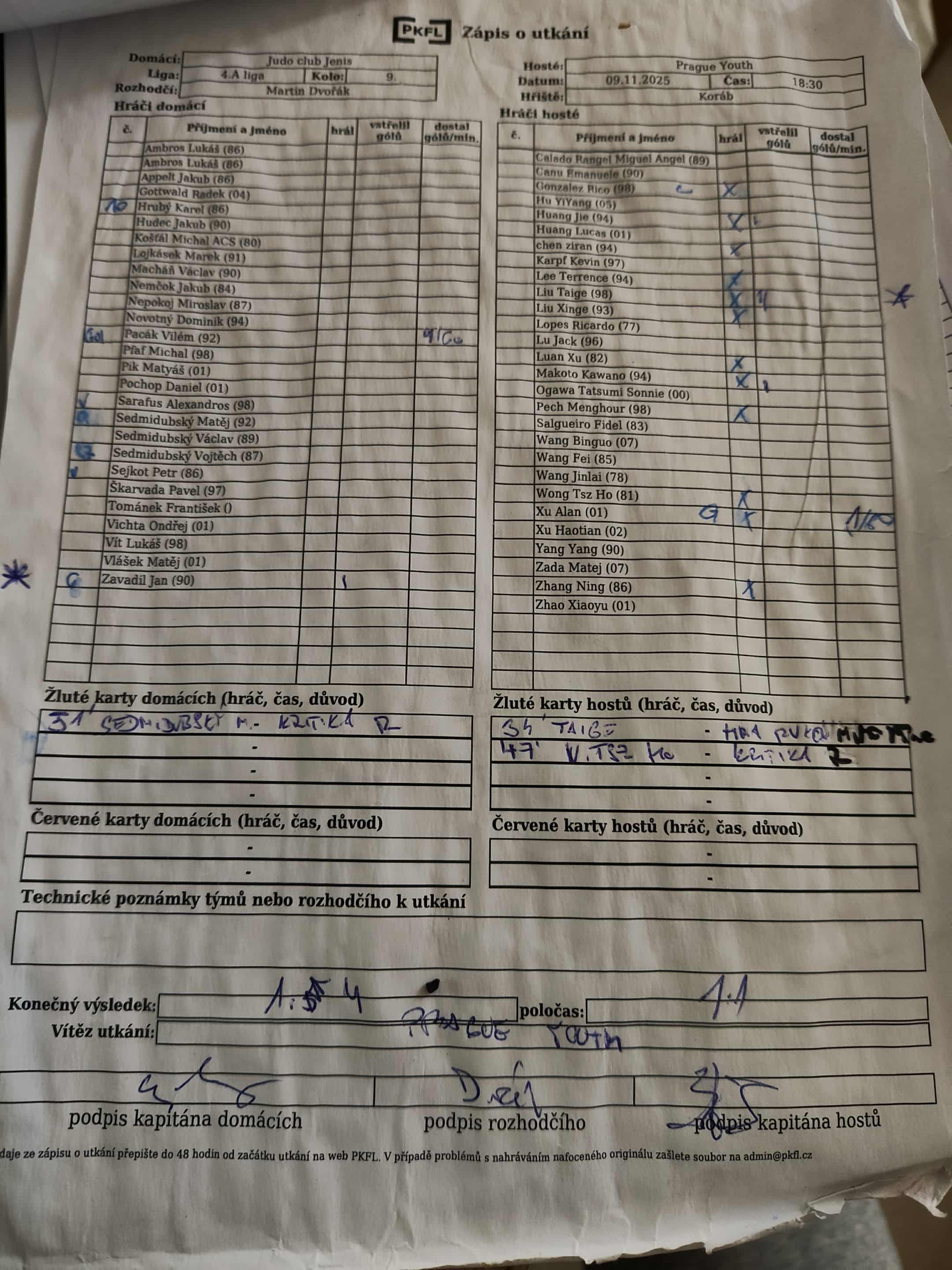 Komentář: 9. kolo (4.A liga) 6. tým tabulky vyzval ten, který momentálně okupuje 2. místo. Do začátku podle tabulky opravdu vstoupili lépe hosté, kteří si vytvářeli více brankových příležitostí a byla na nich vidět větší bojovnost. Domácí vzápětí zlepšili kombinaci a vytvořili si také pár šancí. První, kdo se dostal do vedení byli hosté v 17. minutě, kdy se trefil Liu Taige. Poté hra nabrala spád a téměř před koncem poločasu srovnal za domácí tým Jan Zavadil. Do šaten se šlo za stavu 1:1, který vyhovoval více domácímu týmu. Následující půle a její start do ní nevyšel vůbec domácímu týmu. I přesto, že byl hostující hráč odměněn žlutou kartou v 34. minutě se opět dostali do vedení hosté a to dvěma rychlými brankami v horizontu čtyř minut mezi 37' - 41' a o vítězi bylo prakticky rozhodnuto. Na závěr padla další branka hostů a tím i zápas skončil.