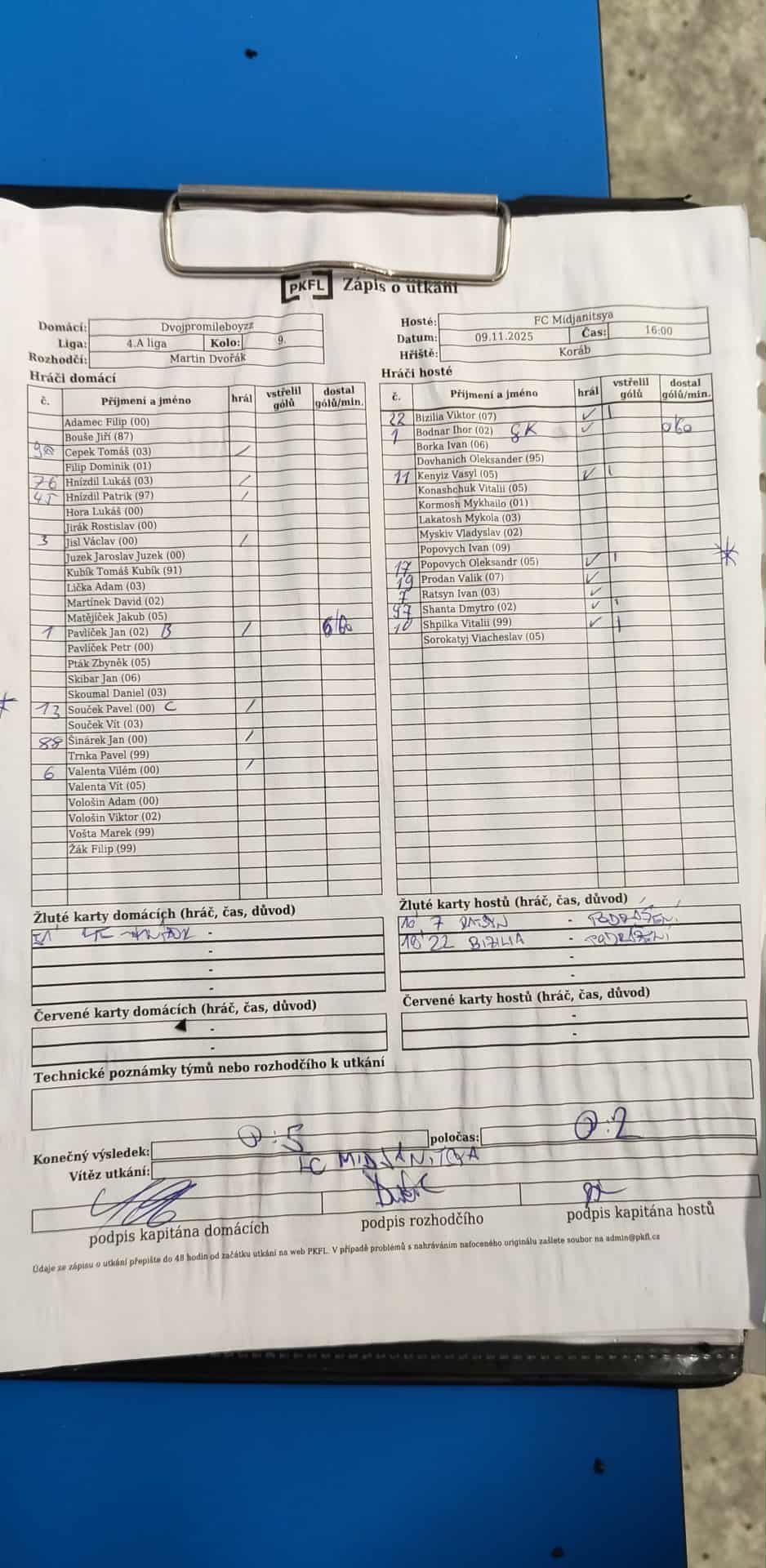 Komentář: 9. Kolo 4.A ligy mezi trápícím se týmem Dvoupromileboyzz a současným vedoucím týmem FC Midjanitsya nenabídl žádné výrazné překvapení. Na začátku první půle padla téměř brzy žlutá karta. Poté se hra uklidnila. Oba týmy měli několik šancí,ale hosté byli více produktivnější. 0:1 a poté gólem do šatny na 0:2. Vstup do další půle měli domácí výrazně lepší, ale trápilo je přesnější zakončení. Většinou,kdy domácí spálili šance , tak hosté je přečíslili a díky domácímu brankáři křesali naději na lepší výsledek. Kolem 45. Minuty to ale bylo opět hosté,kteří utekli domácím do vícebrankového vedení a dokázali i udržet nulu pro svého brankáře. Vybrat nejlepší hráče nebylo těžké u domácích (Souček Pavel), za to u hostů se jednalo po jedné brance o složitější situaci. Díky individuálnímu přístupu a vytvoření šancí jsem vybral Oleksandra Popovyche.