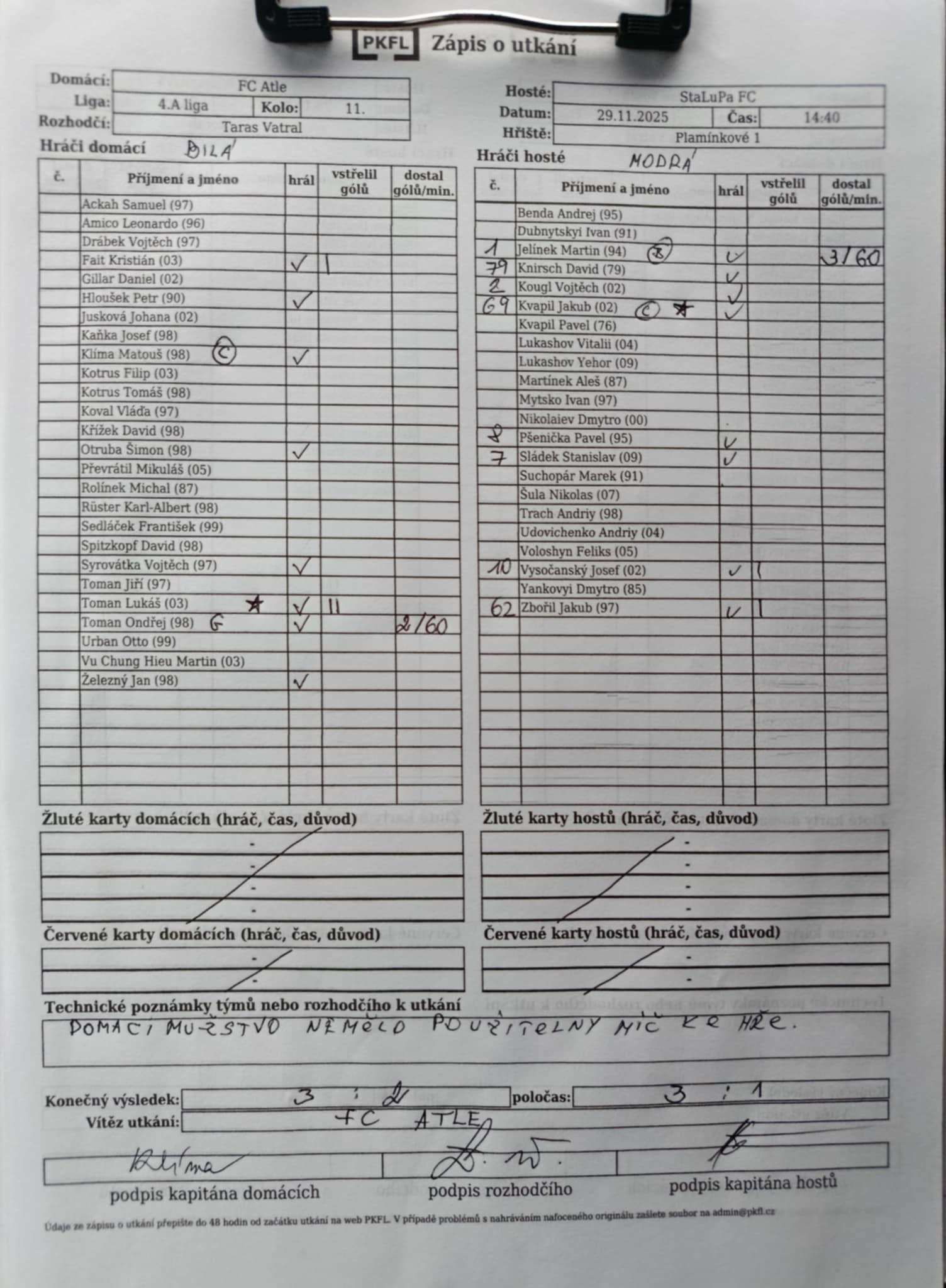 Komentář: Nervózní první poločas,ve kterém domácí byli o hlavu lepší.V druhém dějství hosté se probrali a kdyby proměnili penaltu tak mohli brat aspoň bod. Zasloužená výhra Atle.