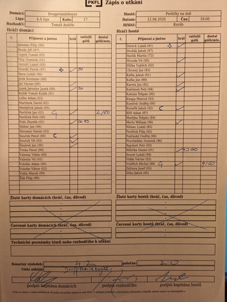 Komentář: Hráči "Dvojpromileboyzz" byli lepší na míči, lépe kombinovali, lépe se přesouvali do útočné fáze a nakonec i lépe zakončovali - z těchto důvodů si do tabulky připisují plný počet bodů...