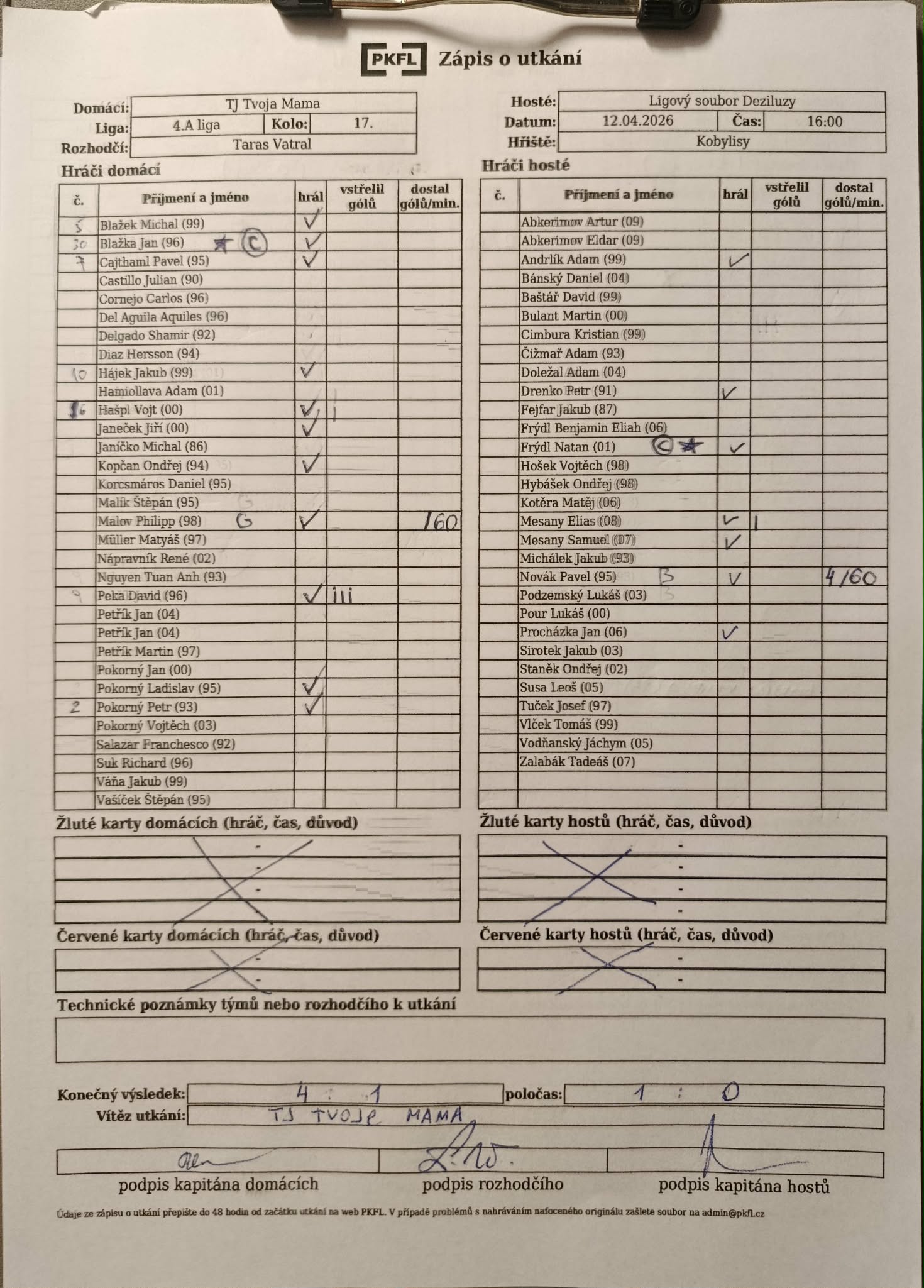 Komentář: Hosté začli utkání pouze v pěti lidech do hry.Domaci využili situace a vytvořili si gólový náskok.V průběhu hry hostům dorazili dvě posily který však neovlivnily až tak herní scénář a celkového vítěze zápasů. Zasloužená výhra Mámy.