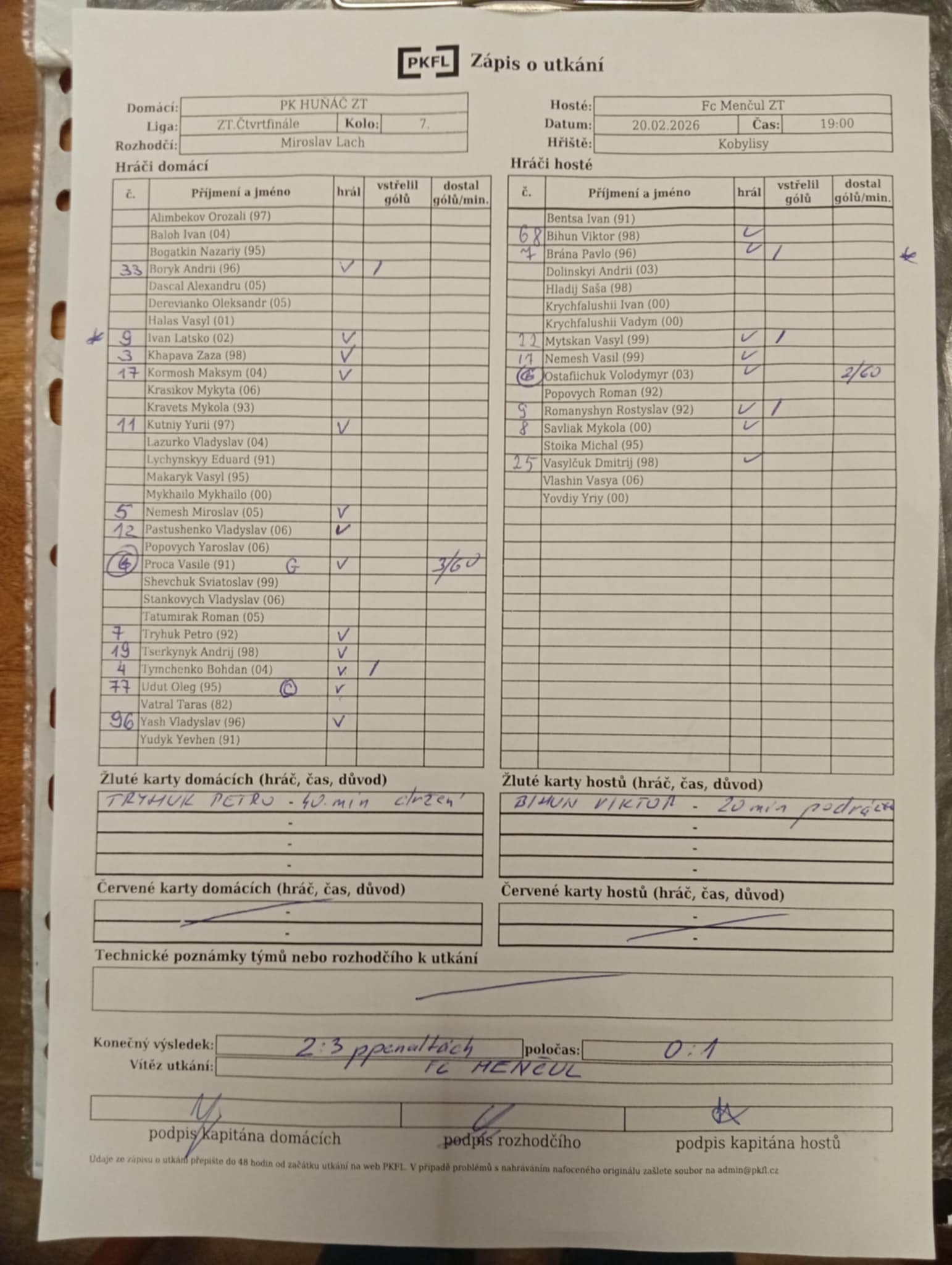 Komentář: Výborný zápas z obou stran, nasazení od první do poslední minuty. Šedesát minut nerozhodlo tak se šlo do nastavení, gól nepadl a tak rozhodli penalty. Hostující brankář chytil všechny tři, domácí jenom dvě a tak z postupu se těší Menčul.
